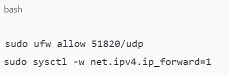 You will use your firewall tool (for instance, UFW) to open the port for Thielen of tables to accept IP forwarding.