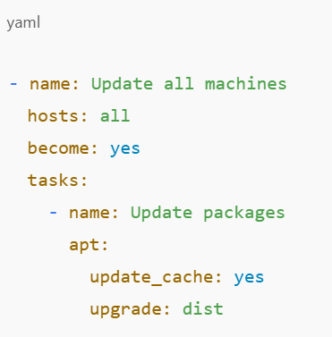 Suppose that you are keen on keeping all your devices up to date. Its corollary is that you would write a playbook, which is a YAML file that contains what is expected to occur. Here’s a basic example: